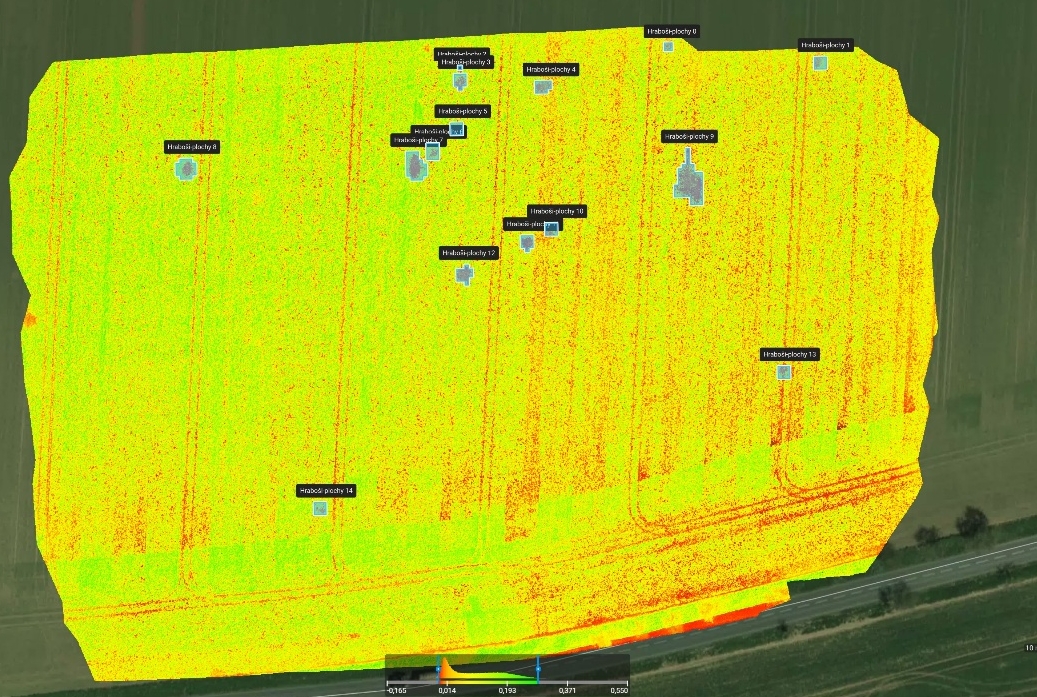Najít nory hrabošů pouhým okem ale není jednoduché – často splývají s okolím. Moderní drony vybavené RGB i multispektrální kamerou však přinášejí chytré řešení. Díky tomu dokáže odhalit i jemné rozdíly ve stavu vegetace. V místech, kde hraboši aktivně žijí, bývá tráva nebo porost poškozený a na snímcích se tyto oblasti projeví jako zřetelné odchylky.
